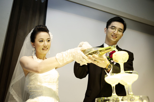在美國遊學時相戀,回到台灣來結婚的Vivian&Eddie,是感情濃密的戀人,二人的個性超級NICE,有一群喜歡跳舞的美女伴娘群們,Vivian特別安排了連台語歌都會唱的外國樂團,請大家上台跳舞,最後連家長都上台一起熱舞唱到很HIGHT的送客,果真有美式戶外婚禮的FU~熱情HIGHT翻了。婚紗:晚禮服美國自買,白紗及婚紗照是‘自助婚紗’這個工作室、宴客:青青時尚花園會館。